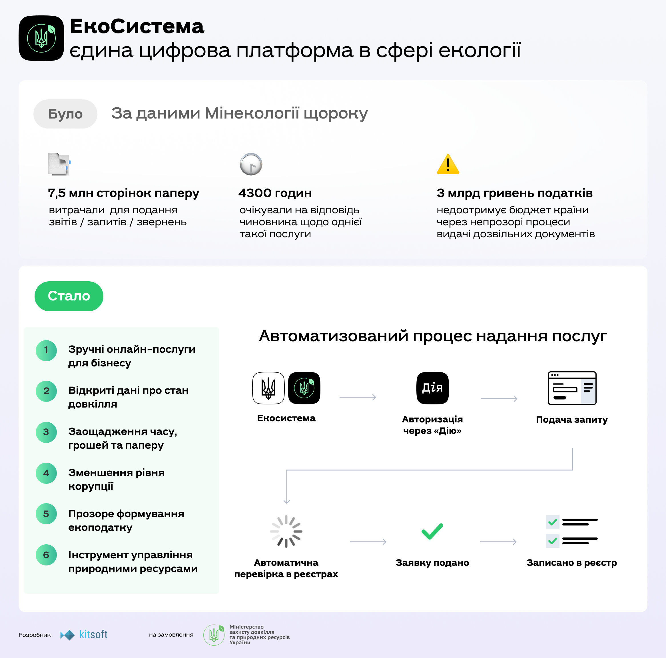 На замовлення Міністерства захисту довкілля та природних ресурсів України компанія Kitsoft розробила цифрову платформу «ЕкоСистема». Підприємства можуть на порталі отримати автоматизовані і прозорі онлайн-послуги у сфері екології, Міністерство — збирати і аналізувати дані економічні і екологічні дані, а громадськість — відслідковувати стан навколишнього середовища.